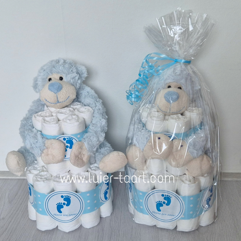 De luiertaart verpakken wij sierlijk met doorzichtig folie en mooi sierlint.